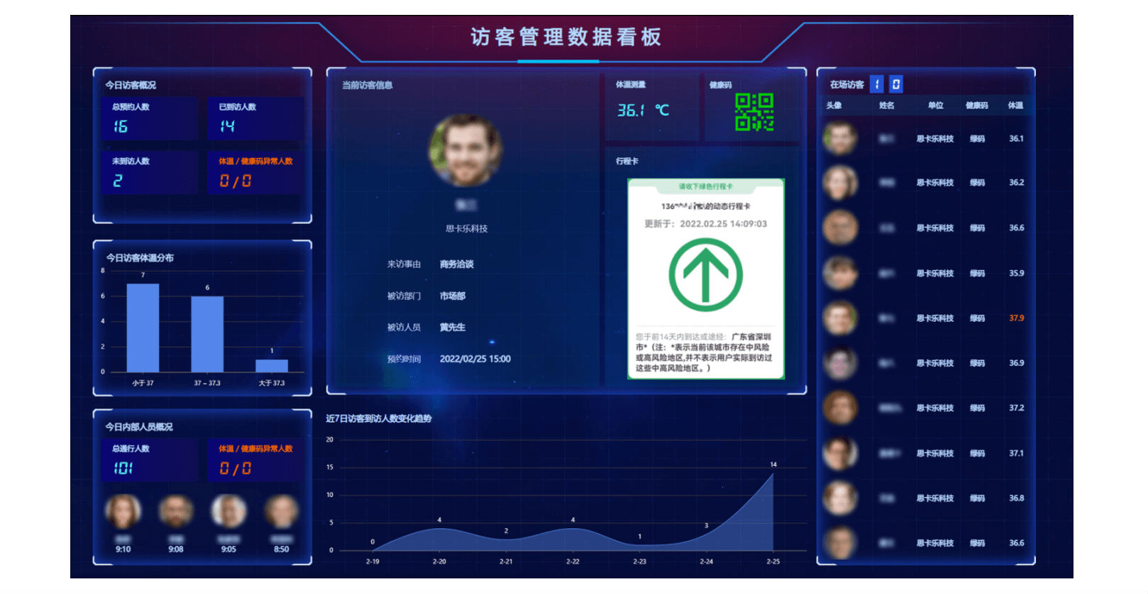 未提前預(yù)約登記的訪客來訪,訪客可通過現(xiàn)場的訪客一體機(jī)進(jìn)行登記,訪客一體機(jī)支持身份證件快速登記,同時(shí)支持人證比對(duì)、體溫測量、健康碼狀態(tài)核驗(yàn)等功能,信息提交由被訪人審批通過后,可打印訪客單掃碼或刷臉通行。