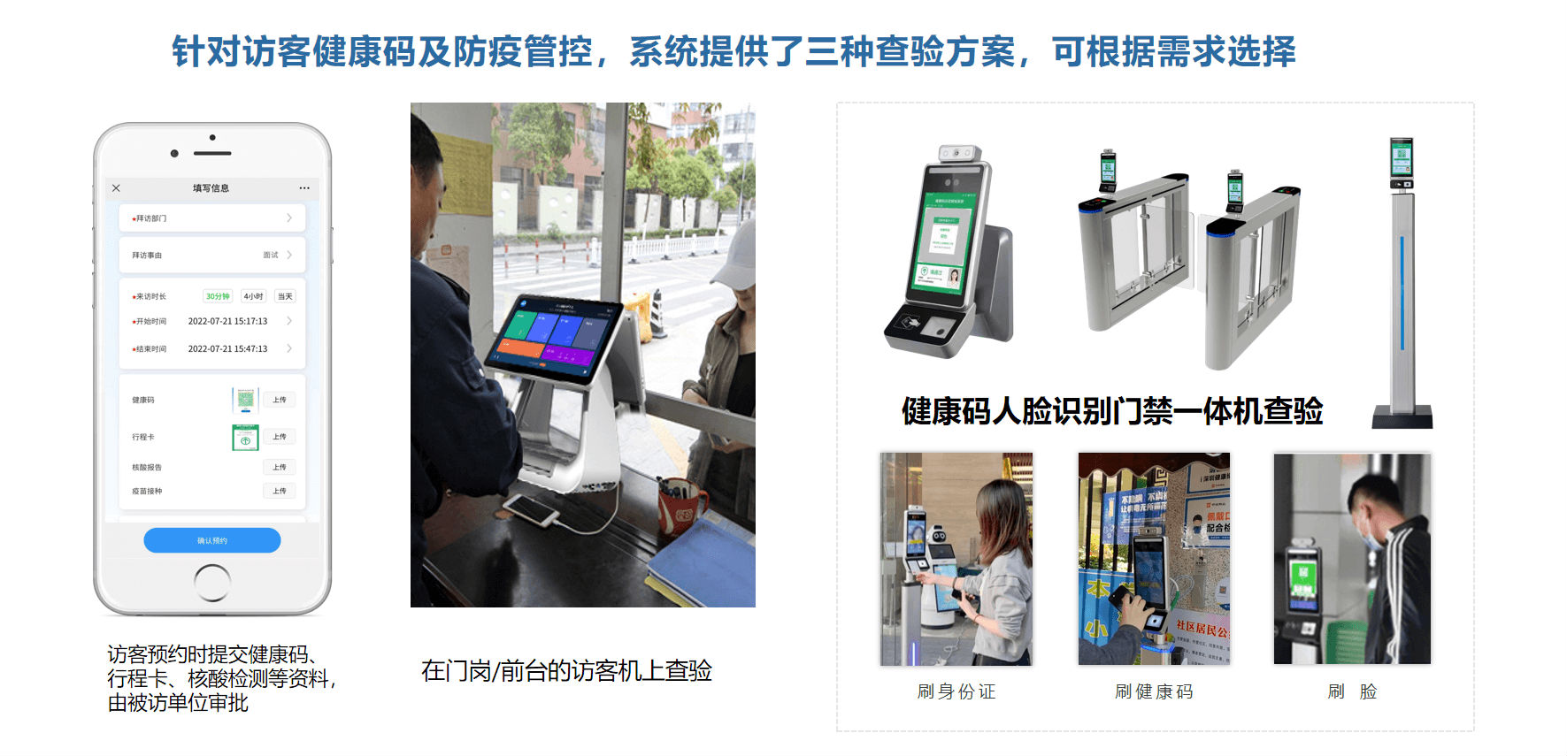 主要用于訪客到訪后在校門口進(jìn)行金陵網(wǎng)證識(shí)別、蘇康碼識(shí)別和測溫,還支持二代身份證讀取、證件OCR識(shí)別、人證比對(duì)核驗(yàn)、訪客快速登記、預(yù)約核驗(yàn)、現(xiàn)場登記、訪客簽離、訪客單打印、及訪客信息查詢等功能,方便訪客的到訪登記和身份核驗(yàn)。